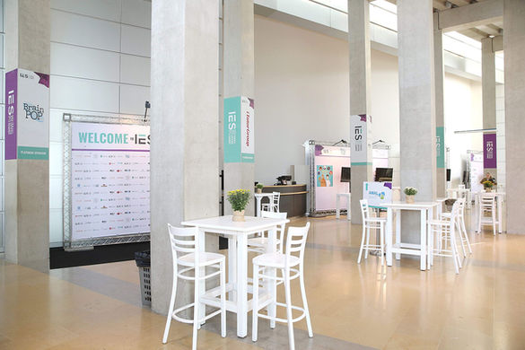חלל הלובי מותג במדבקות קיר, באותו החלל היו דוכני המציגים, קיר העיתונות, לו״ז הכנס והמפת המתחם.